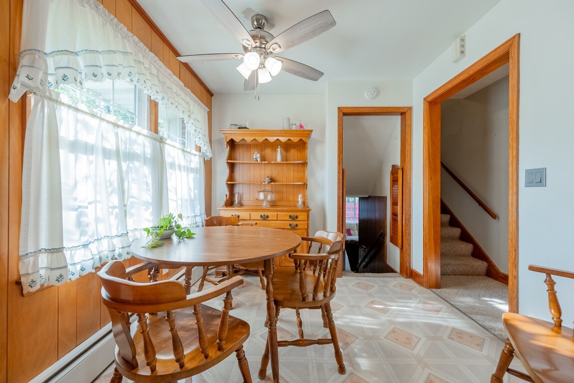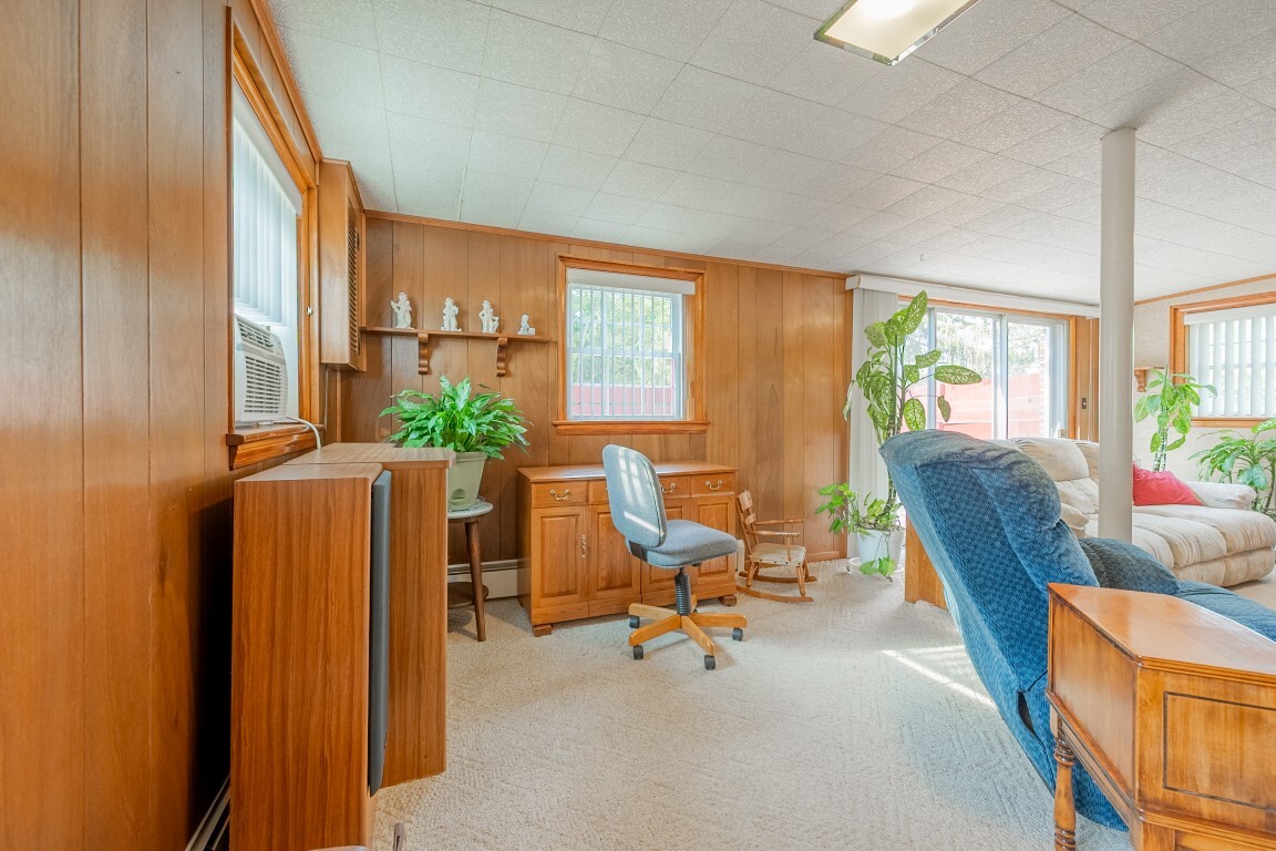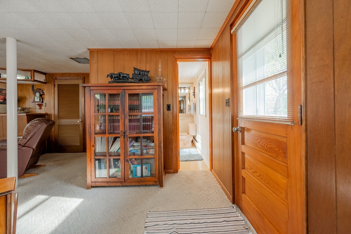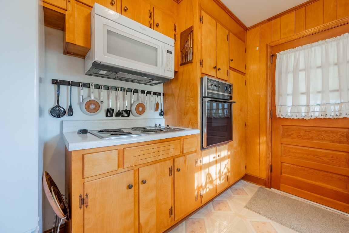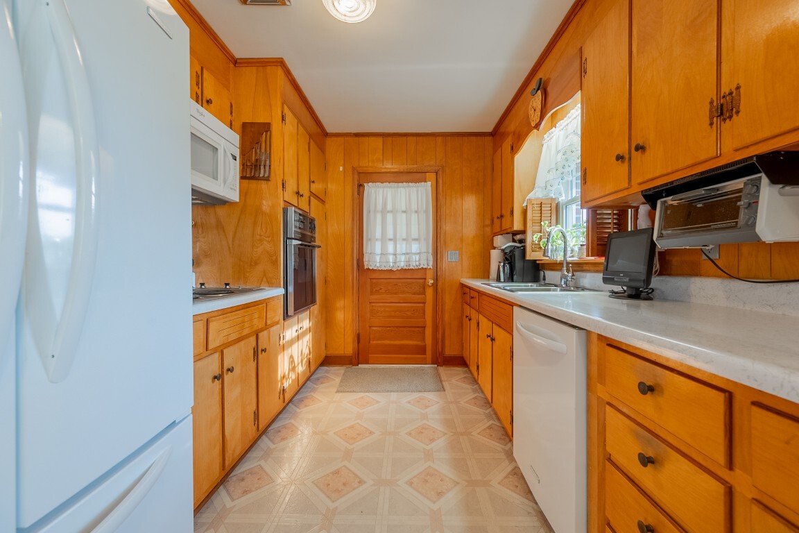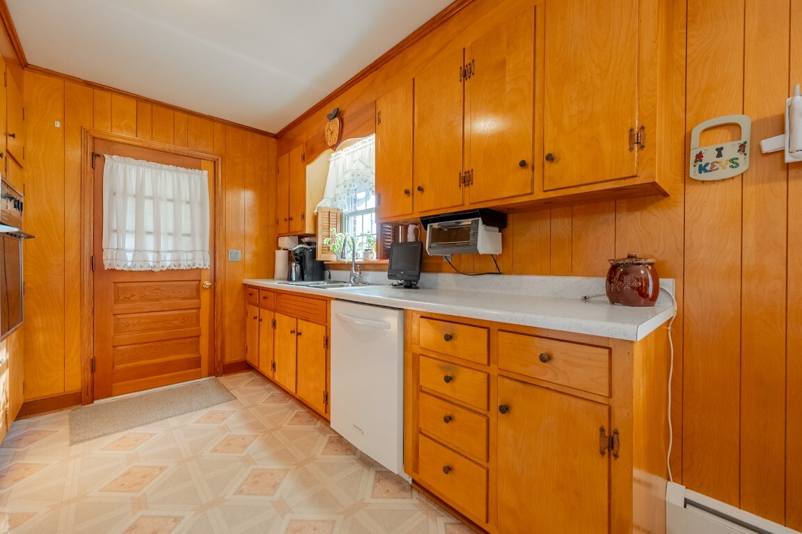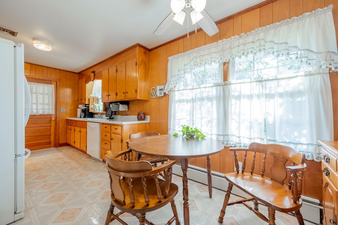 A warm and inviting atmosphere begins with a bright living room where large windows flood the space with natural light. The adjacent eat-in kitchen showcases an abundance of cabinetry, charming wood paneling and provides plenty of room for casual dining. Thoughtfully designed, flowing layout offers distinct yet connected spaces, making it easy to move from room to room while maintaining a sense of coziness and comfort.
