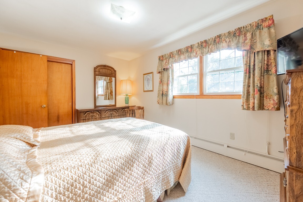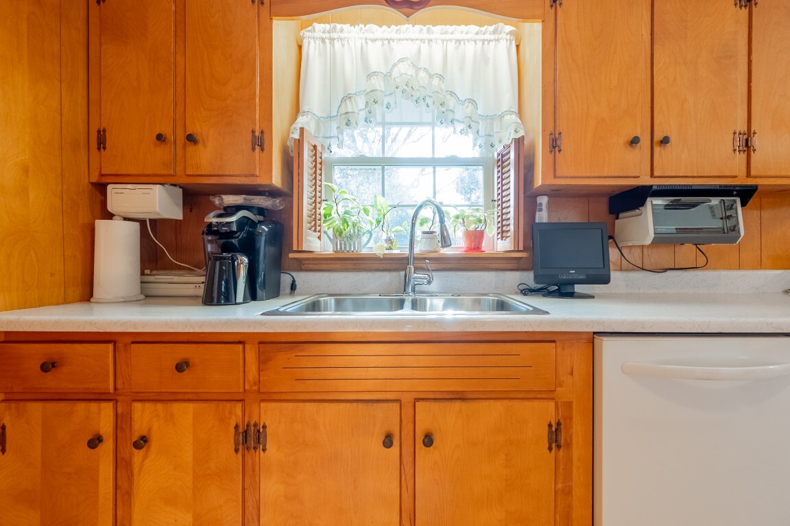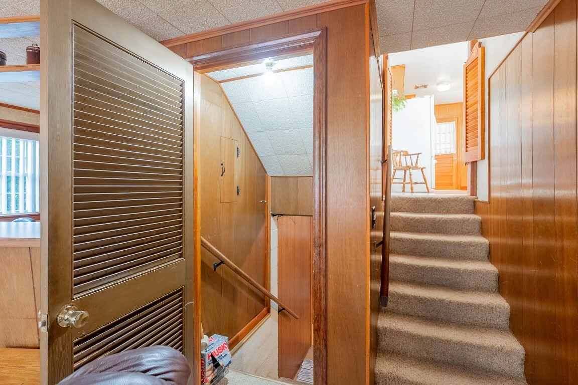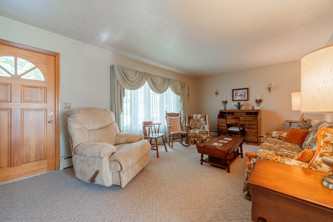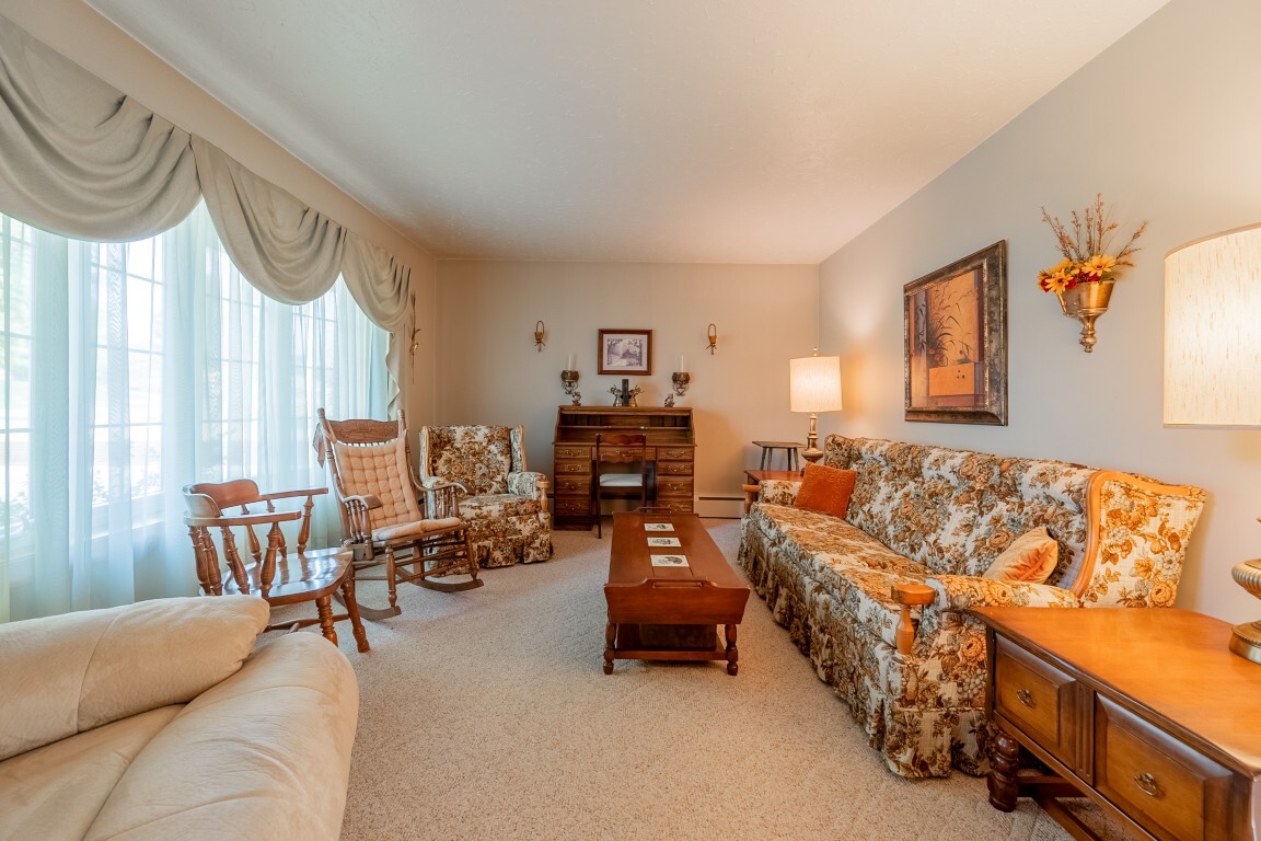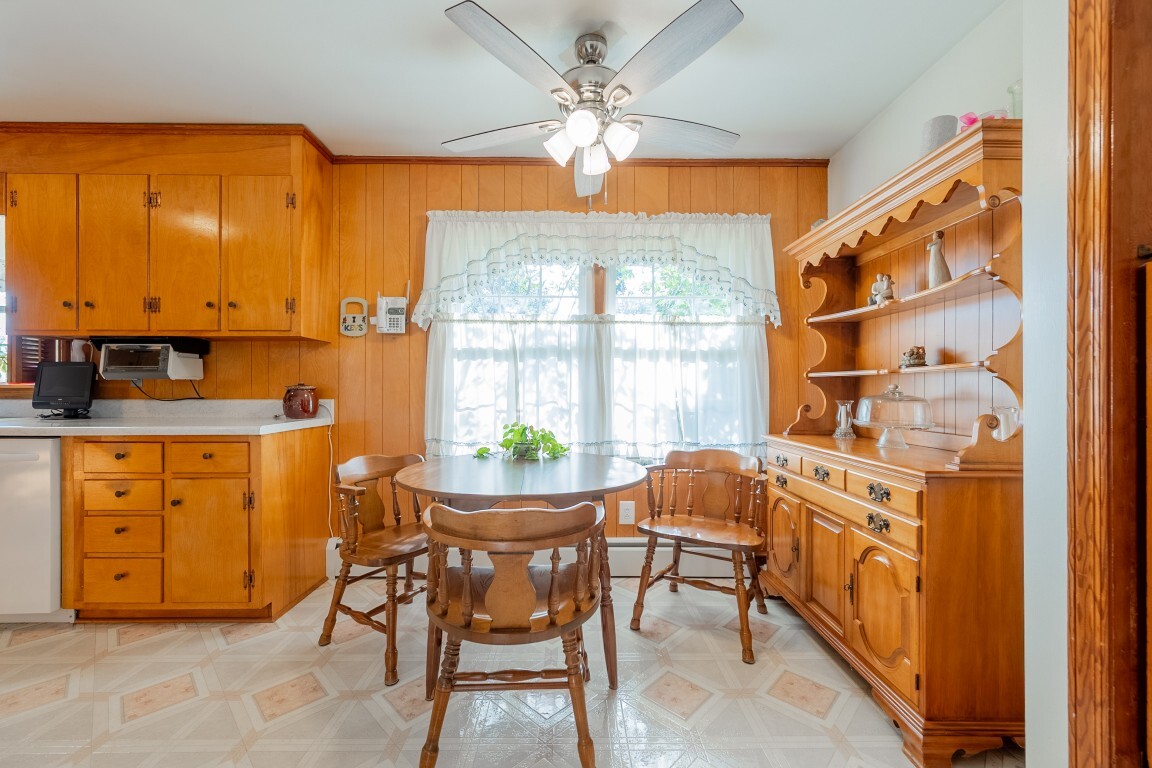 A warm and inviting atmosphere begins with a bright living room where large windows flood the space with natural light. The adjacent eat-in kitchen showcases an abundance of cabinetry, charming wood paneling and provides plenty of room for casual dining. Thoughtfully designed, flowing layout offers distinct yet connected spaces, making it easy to move from room to room while maintaining a sense of coziness and comfort.