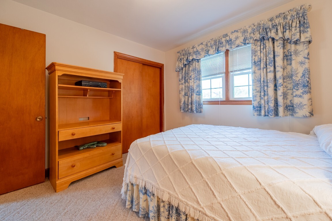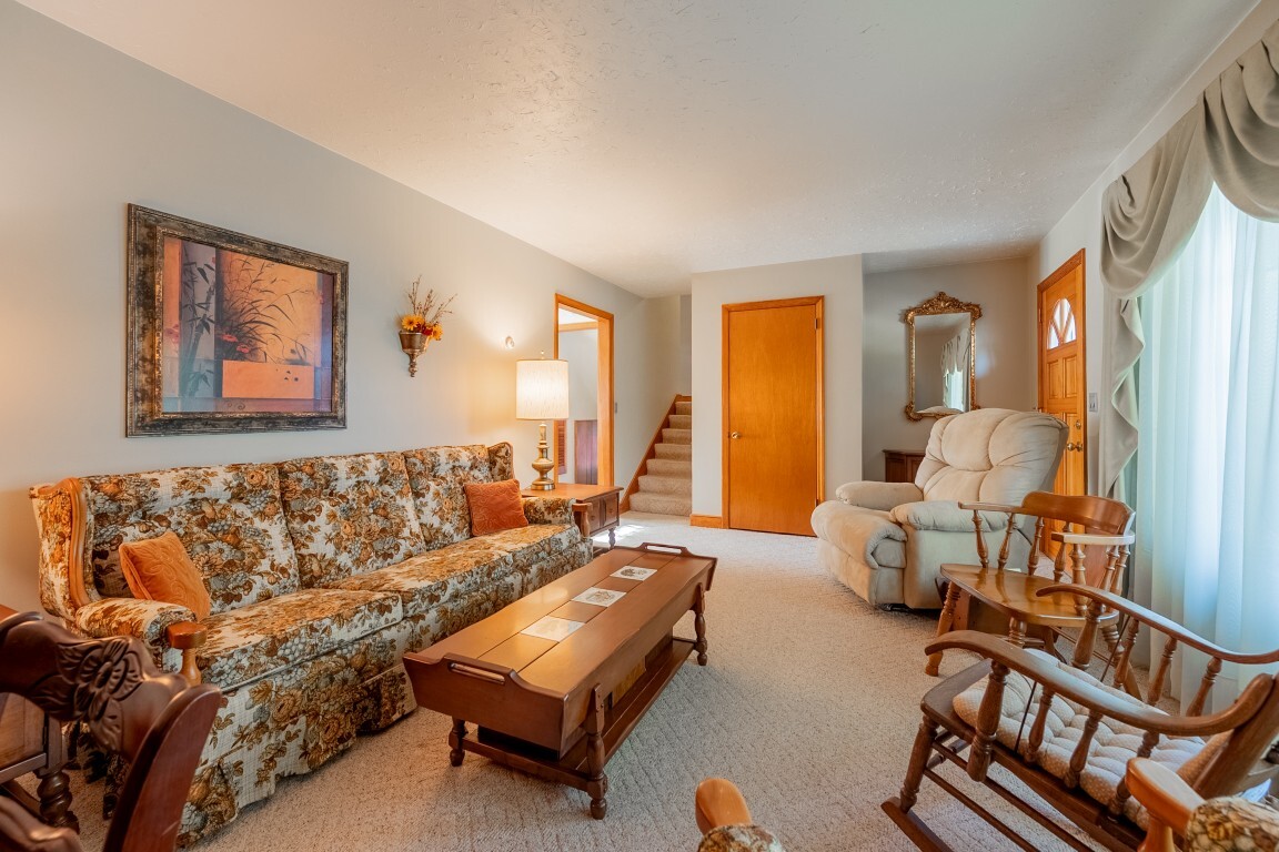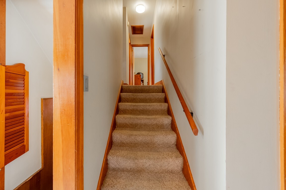 Find the three generously sized bedrooms on the upper level, all featuring plush carpeting for added warmth. Each room offers ample closet space, making organization a breeze, while a well-appointed full bathroom adds everyday convenience.