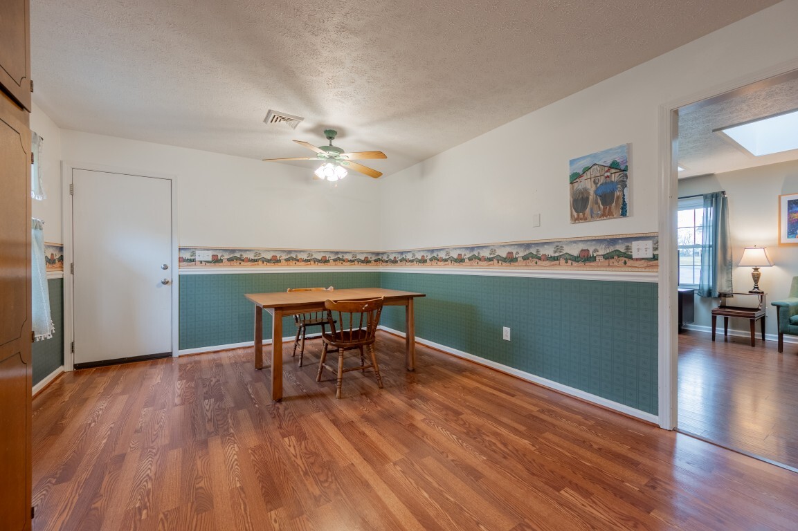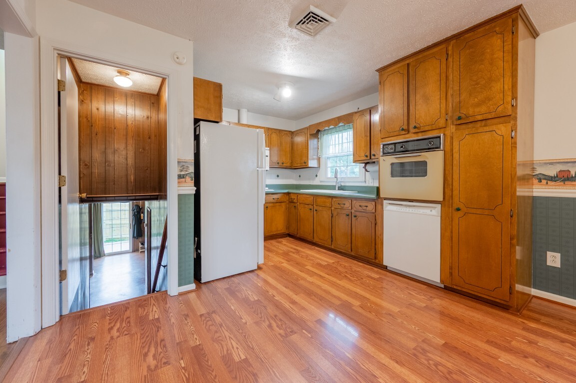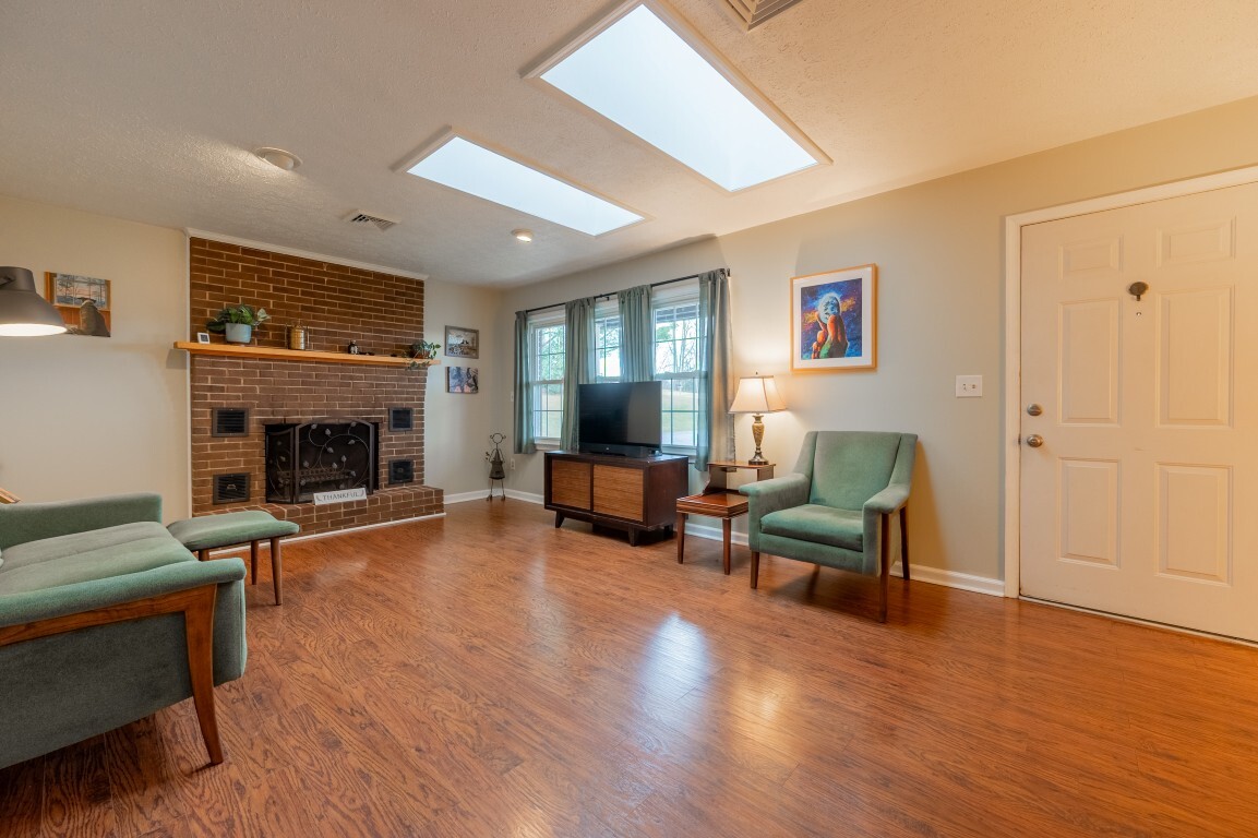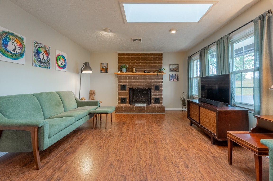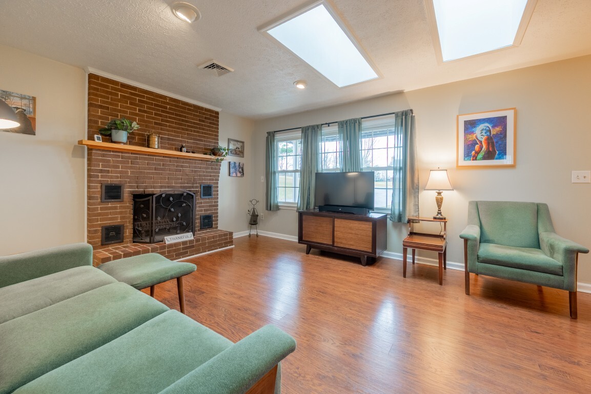 Step inside and be greeted by a sun-drenched living room, where two delightful skylights fill the space with warm, natural light. The charming brick fireplace serves as a cozy centerpiece, perfect for relaxing evenings. With generous space for furniture arrangements, this room creates an inviting setting for everyday living or entertaining. Flowing seamlessly into the spacious eat-in kitchen with a full suite of appliances, including a new refrigerator and oven, making both everyday cooking and special gatherings a true delight. The dining area offers ample room to celebrate holiday feasts or enjoy casual, cozy meals in the heart of the home. Three spacious bedrooms privately located on the upper level, each freshly painted and with new flooring, share an updated bright and functional bath with modern fixtures, plus the primary features a generous walk-in closet!