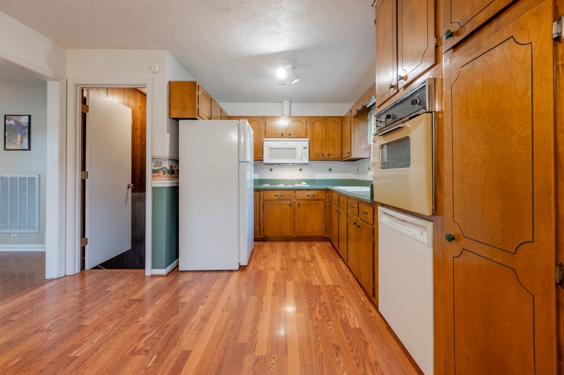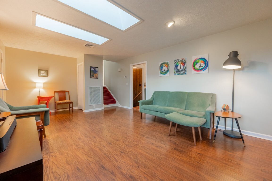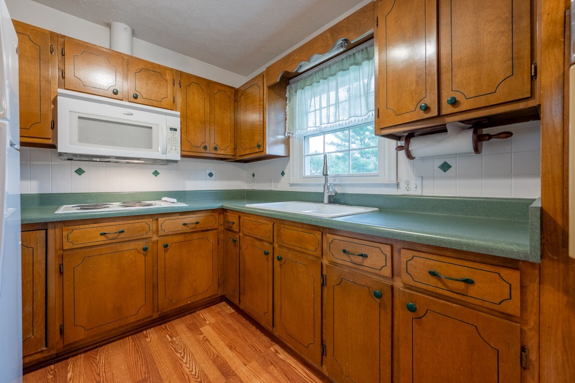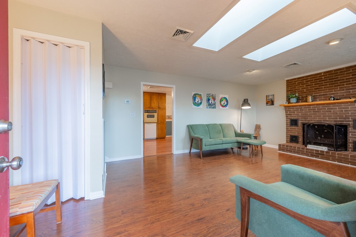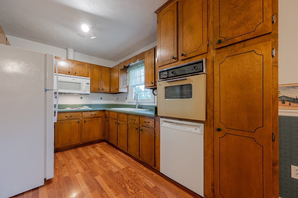 Step inside and be greeted by a sun-drenched living room, where two delightful skylights fill the space with warm, natural light. The charming brick fireplace serves as a cozy centerpiece, perfect for relaxing evenings. With generous space for furniture arrangements, this room creates an inviting setting for everyday living or entertaining. Flowing seamlessly into the spacious eat-in kitchen with a full suite of appliances, including a new refrigerator and oven, making both everyday cooking and special gatherings a true delight. The dining area offers ample room to celebrate holiday feasts or enjoy casual, cozy meals in the heart of the home. Three spacious bedrooms privately located on the upper level, each freshly painted and with new flooring, share an updated bright and functional bath with modern fixtures, plus the primary features a generous walk-in closet!
