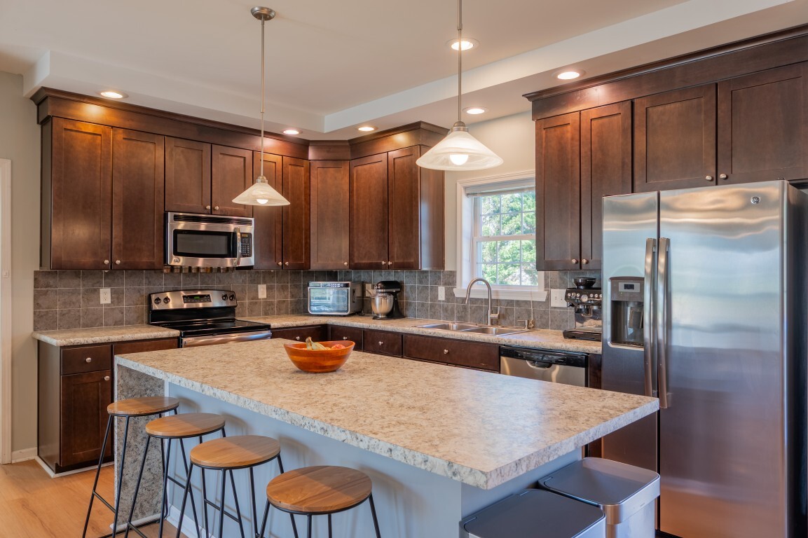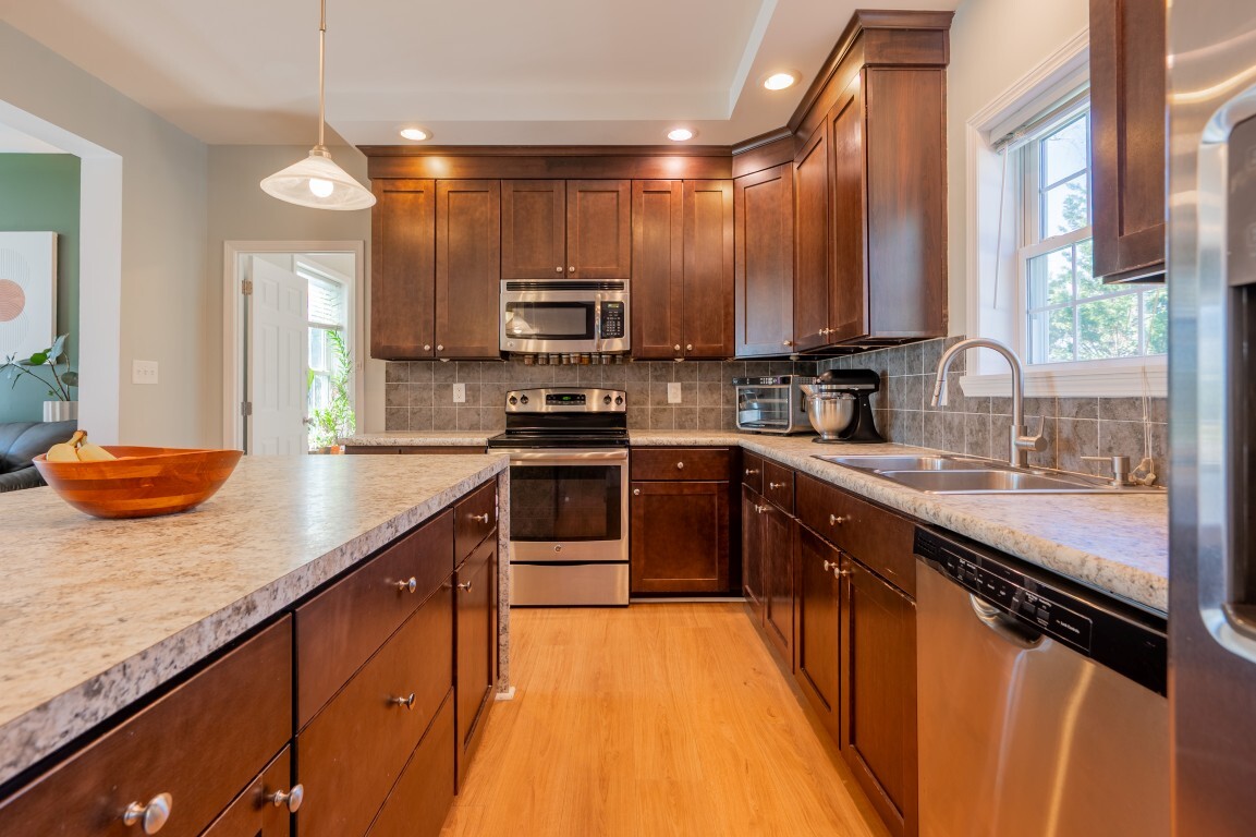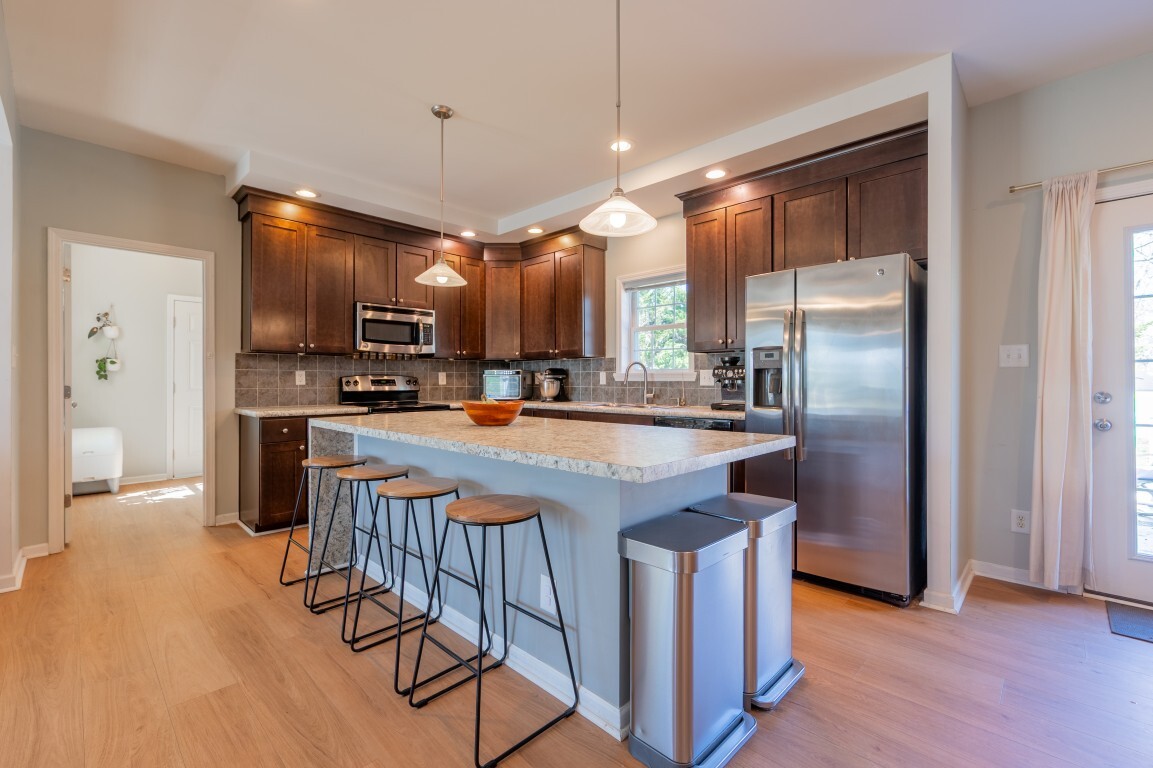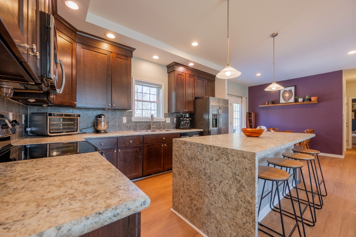 Designed with both function and connection in mind, the kitchen connects effortlessly into the dining area, creating a space that invites conversation and togetherness. The large island with bar seating naturally becomes the centerpiece—perfect for morning coffee, casual meals, or hosting friends. Stainless steel appliances, an abundance of beautiful cabinetry, and a stylish tile backsplash bring both elegance and practicality, while recessed lighting and modern fixtures add a polished, contemporary touch that ties it all together. A conveniently located laundry room adds ease to daily routines, keeping everything within reach in this well-designed single-level layout.