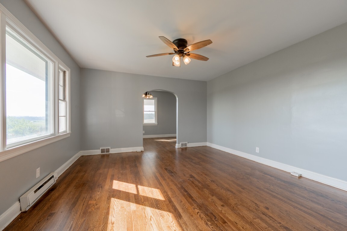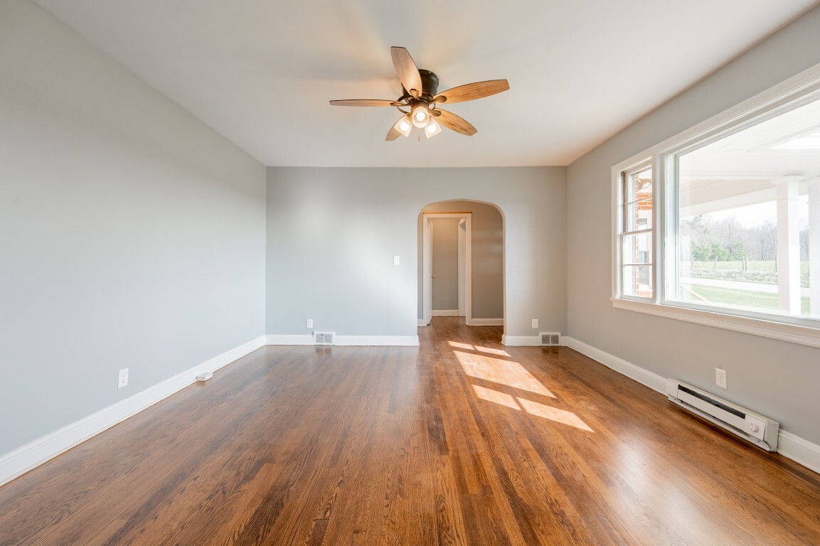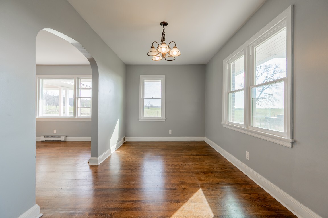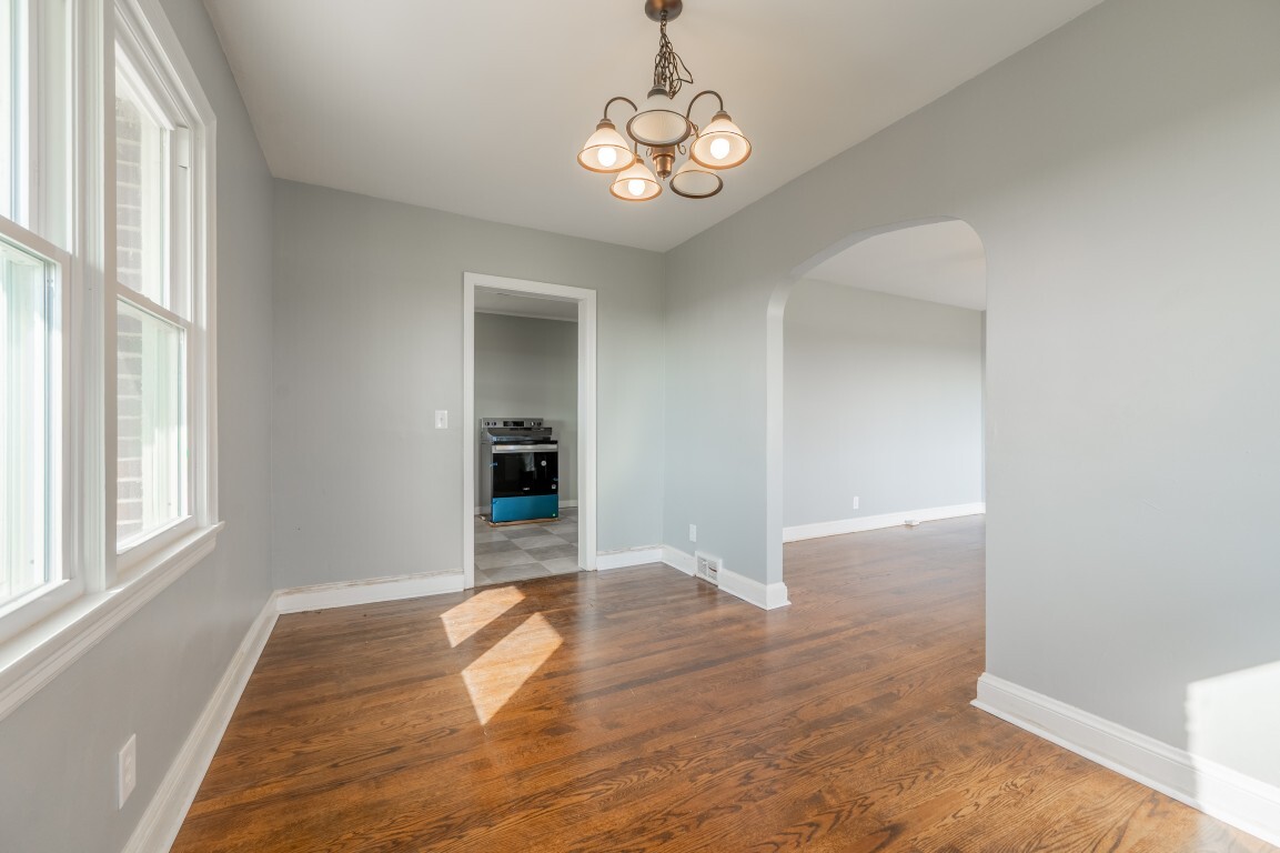 Just beyond, the dining room is framed by charming arched doorways that add character and architectural interest. This space feels inviting and intimate, well-suited for everything from casual dinners to holiday gatherings while remaining connected to the home’s natural flow.