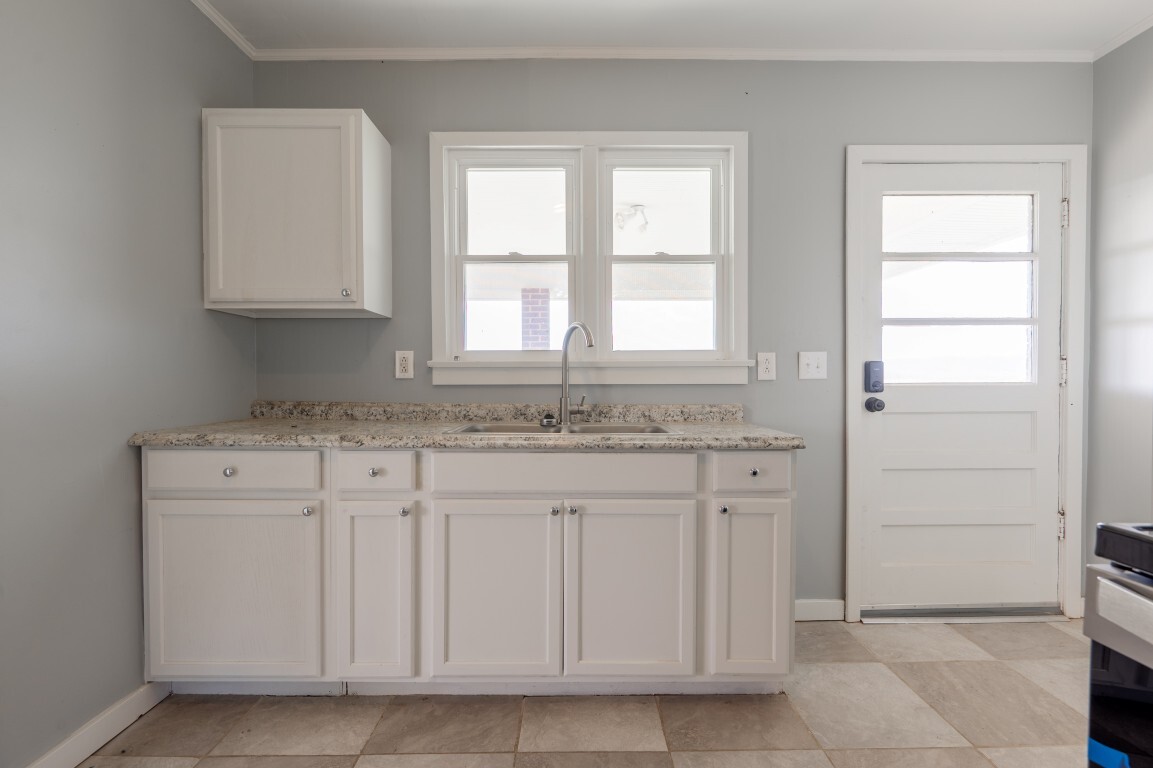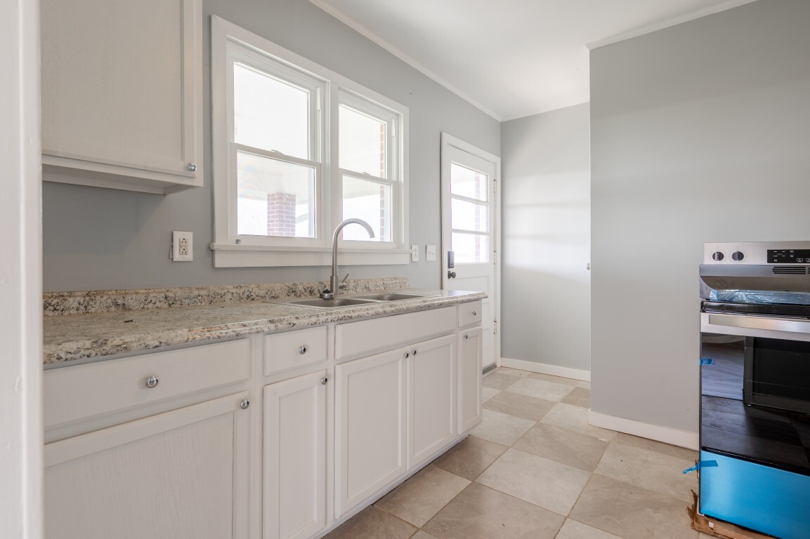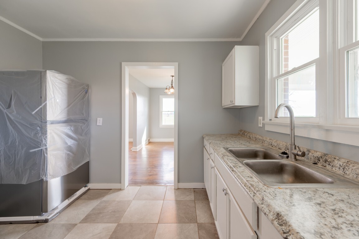 The kitchen is bright and fresh, with a simple layout that offers excellent potential for customization over time. While perfectly functional for everyday use as-is, it does provide the opportunity for additional cabinetry or expanding counter space.