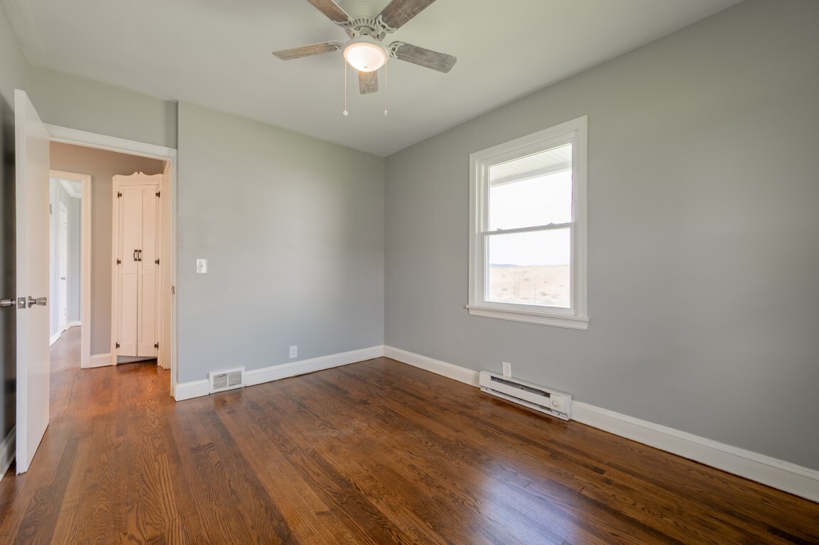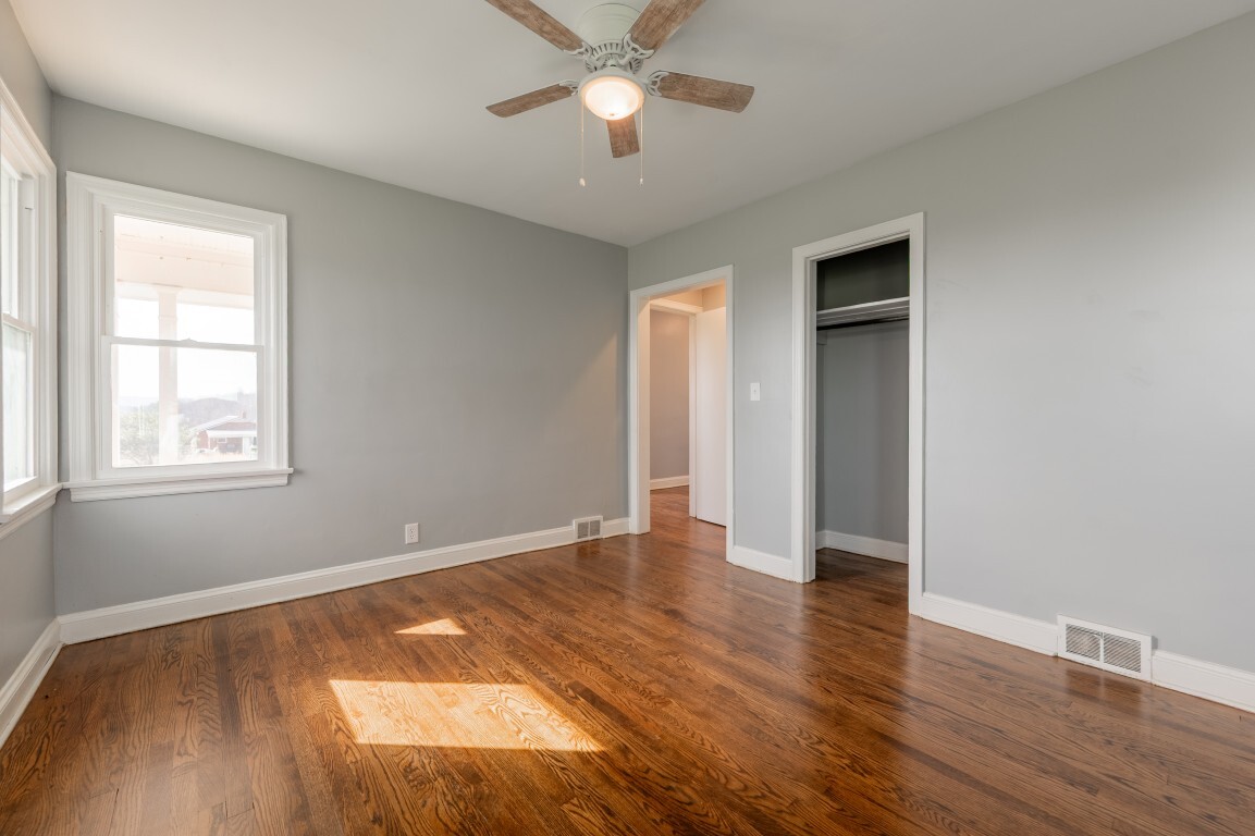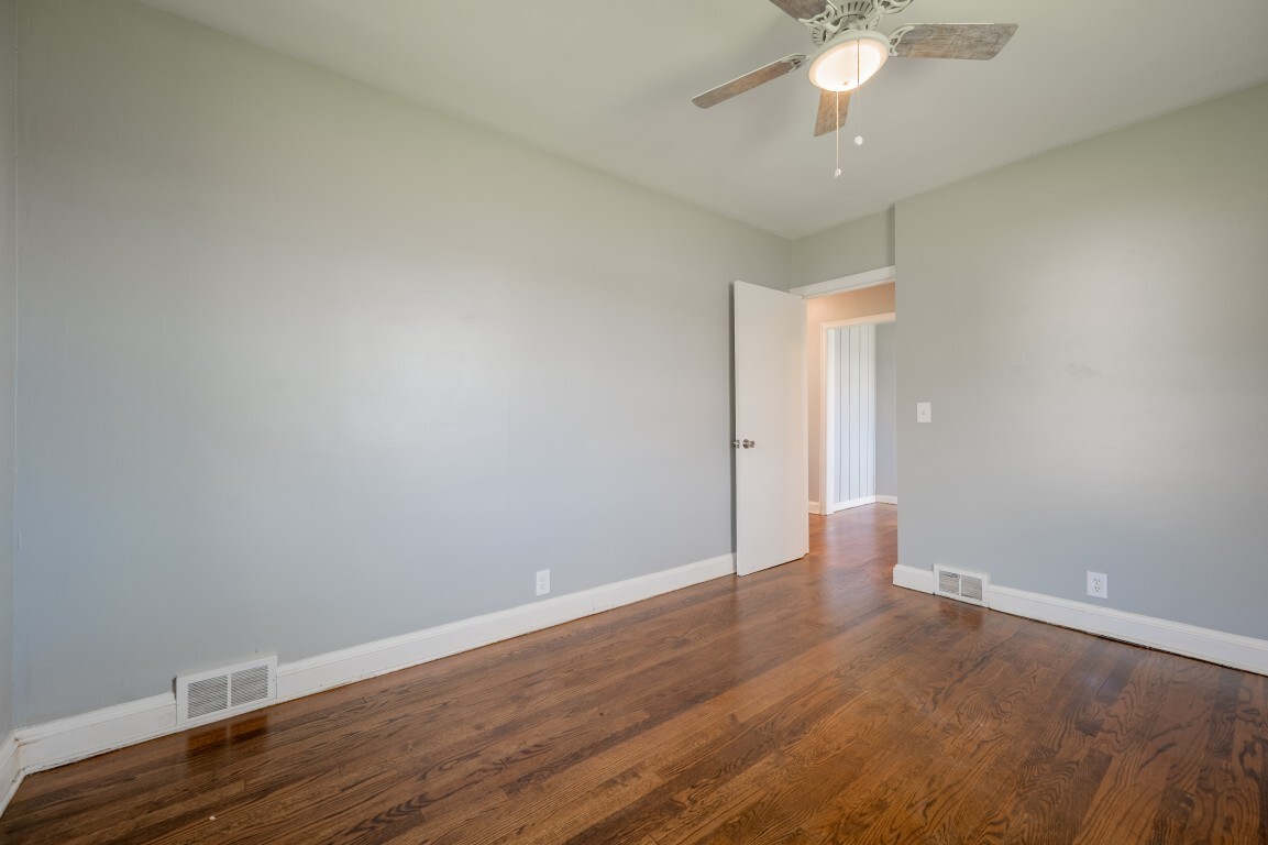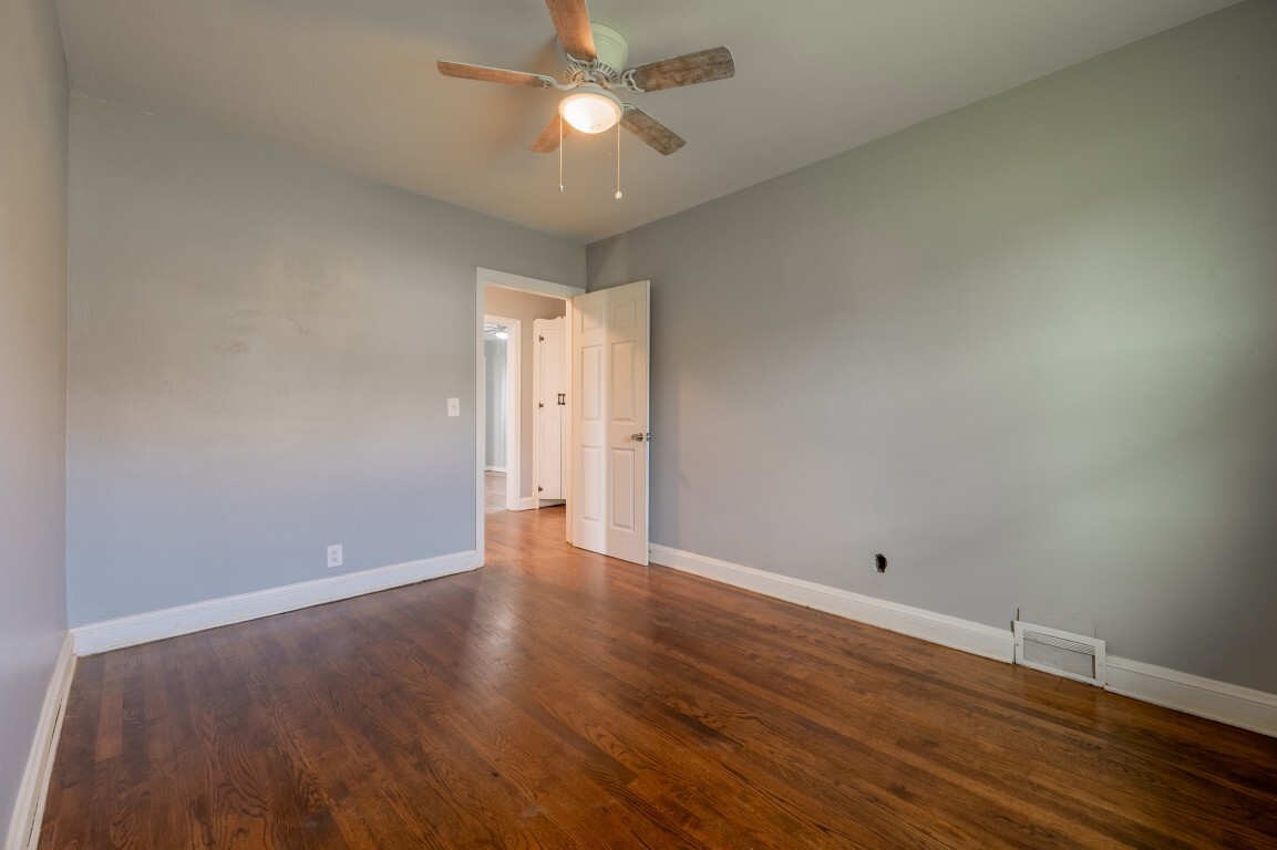 Each of the three bedrooms offers a peaceful retreat for family or guests, filled with soft natural light, grounded by the same warm hardwood flooring, cooled by ceiling fans, and providing ample closet storage. The bathroom is centrally located and thoughtfully designed for convenience, with easy accessibility from all bedrooms.