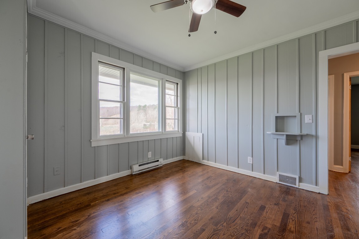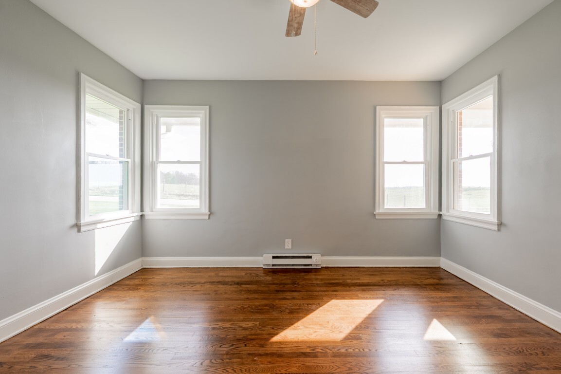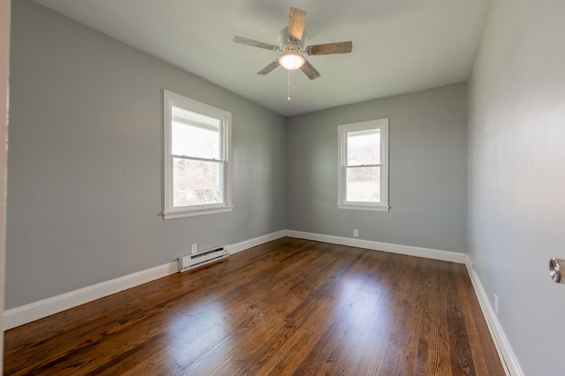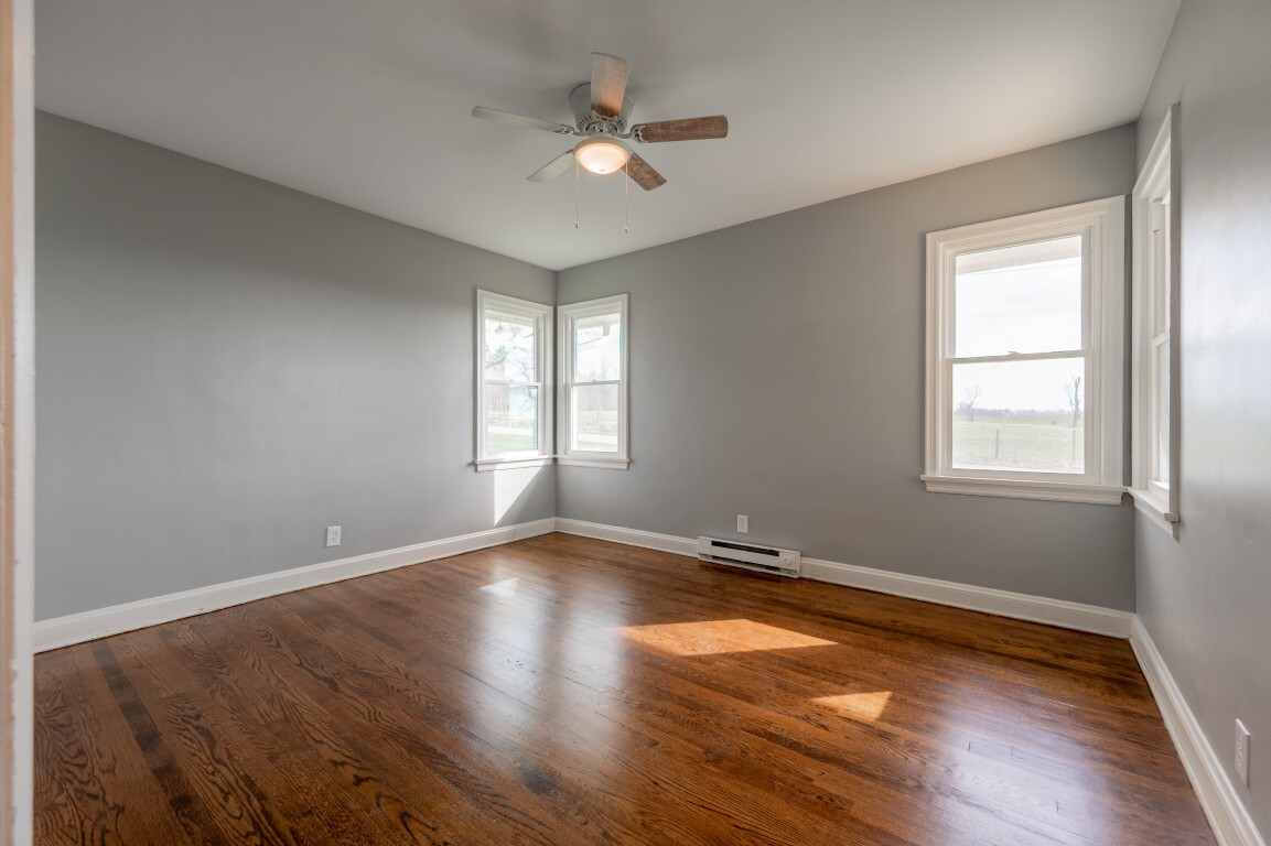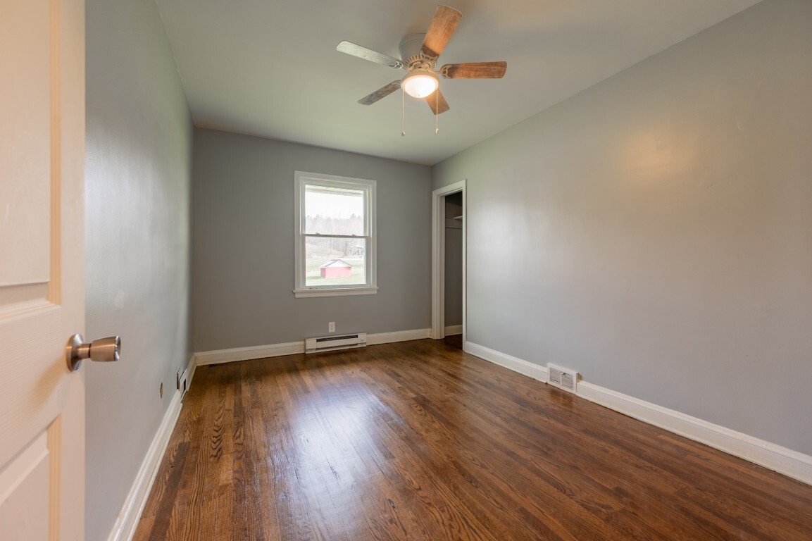 Each of the three bedrooms offers a peaceful retreat for family or guests, filled with soft natural light, grounded by the same warm hardwood flooring, cooled by ceiling fans, and providing ample closet storage. The bathroom is centrally located and thoughtfully designed for convenience, with easy accessibility from all bedrooms.
