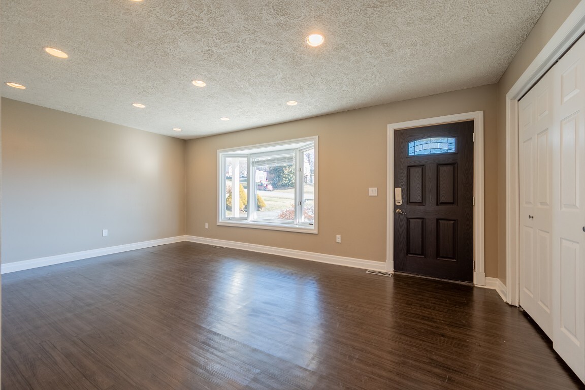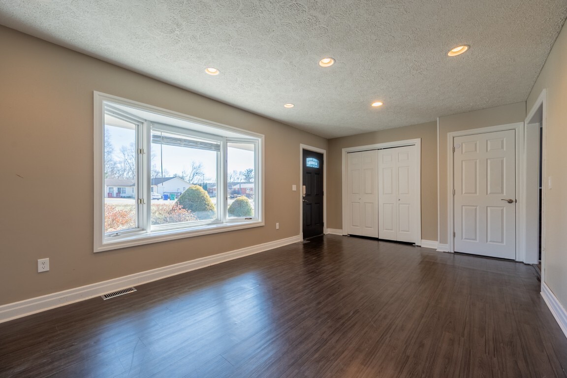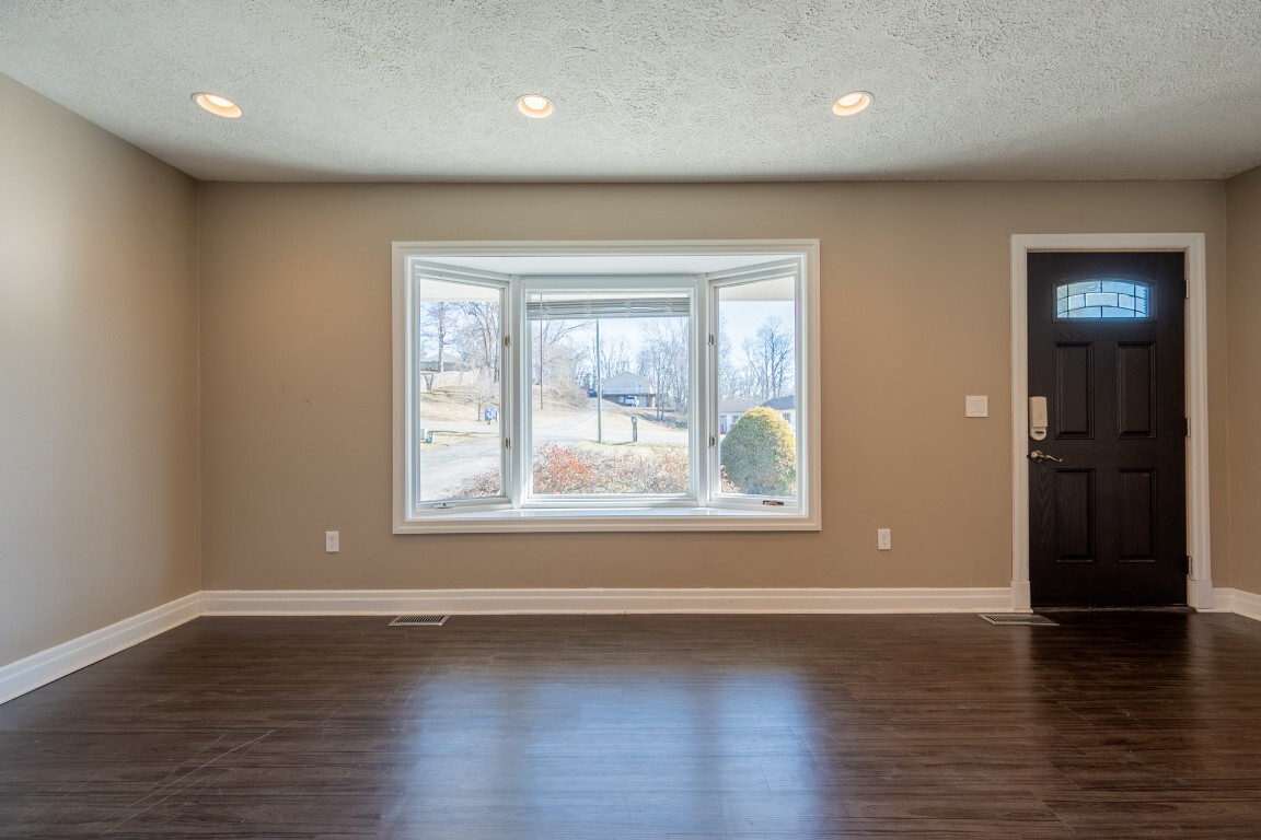 The spacious living room is bathed in natural light thanks to a beautiful bay window, creating a warm and welcoming atmosphere. Luxury vinyl plank flooring adds both style and easy maintenance, while the generous layout offers multiple furniture arrangements for comfortable everyday living.