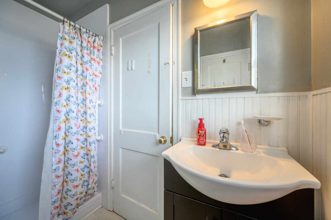 The lovely updated full bath features a sleek walk-in shower for convenience and accessibility. Clean finishes and thoughtful updates create a fresh, spa-like feel designed for comfort and ease.